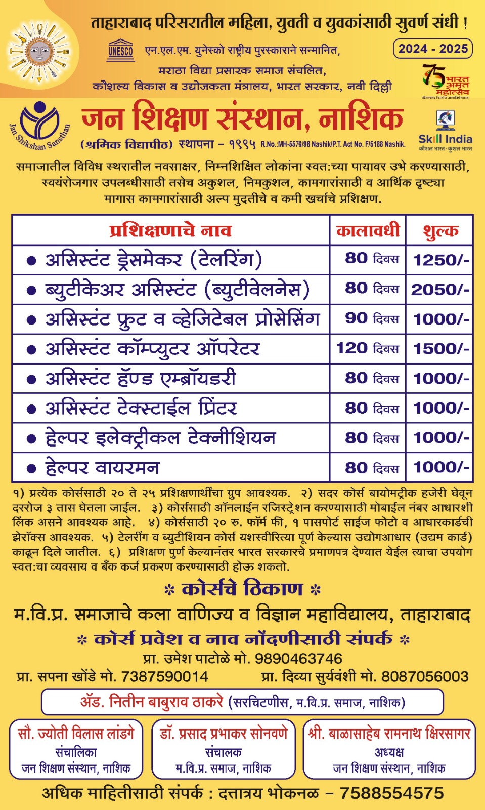 Home > Notice Board > जन शिक्षण संस्थान, नाशिक व कला, वाणिज्य व विज्ञान महाविद्यालय ताहाराबाद, यांच्या संयुक्तविद्यमाने व्यावसायिक अभ्यासक्रमांची सुरुवात